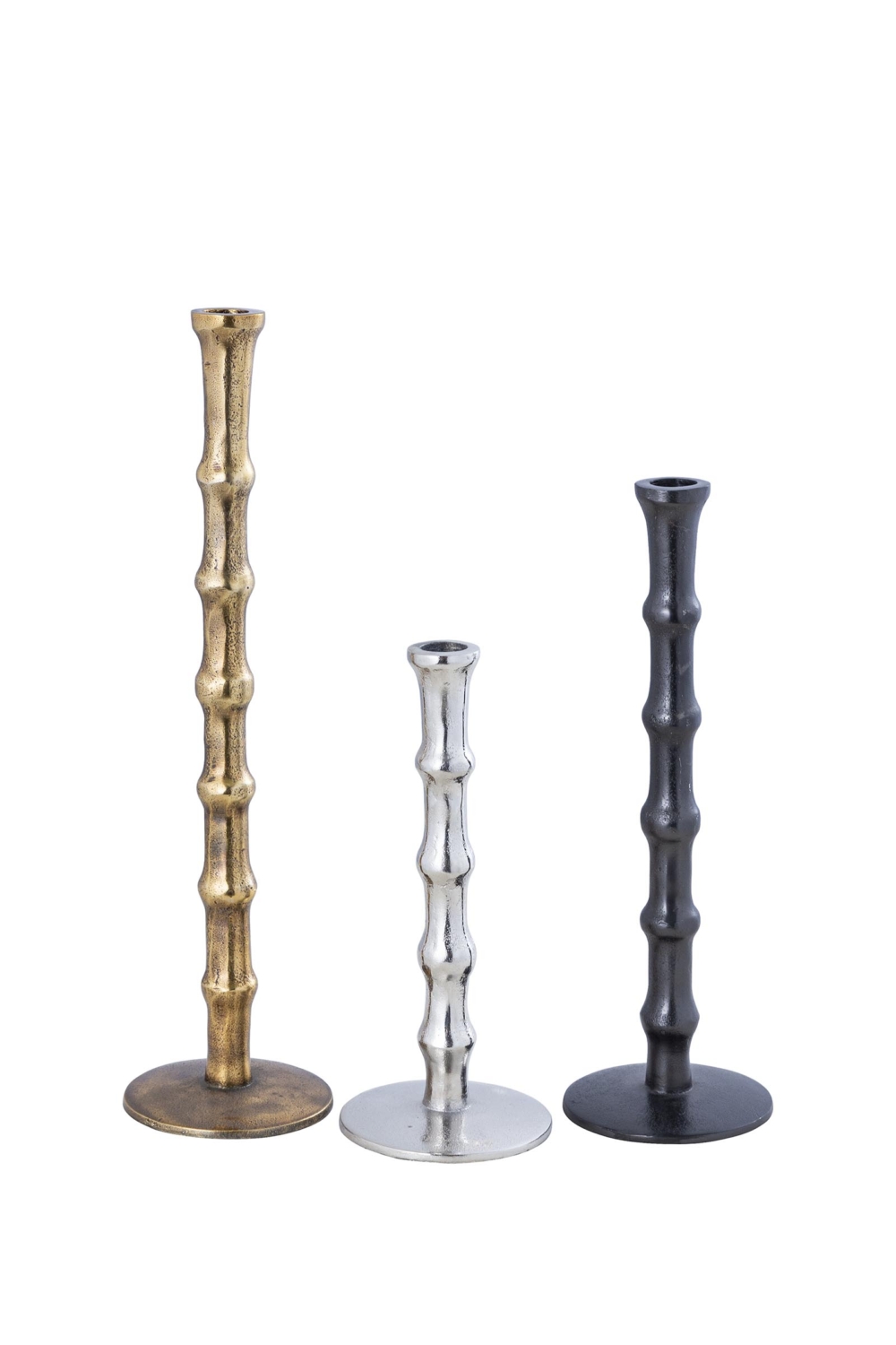 A weighted, sculptural stand in brass or aluminium ensures stability while highlighting the candle’s form and presence.
