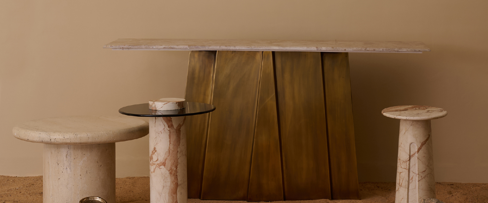 Zamin, meaning “the ground” or “the earth,” anchors its aesthetic in permanence. This collection finds poetry in weight, stone slabs, brushed brass, and burnished bronze working together to create forms that are at once monumental and refined. Every surface tells a story of origin, a reminder of where we come from. The pieces are not just designed to occupy space, but to define it, imparting a sense of rootedness and belonging.