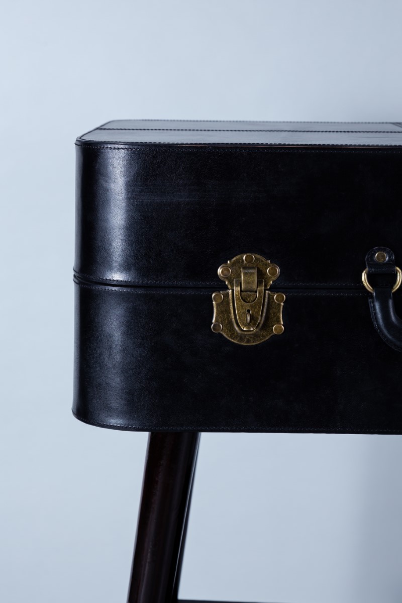 Material: WOOD & LEATHER Finish: NATURAL BLACK LEATHER WITH BRASS ANTQ FEET