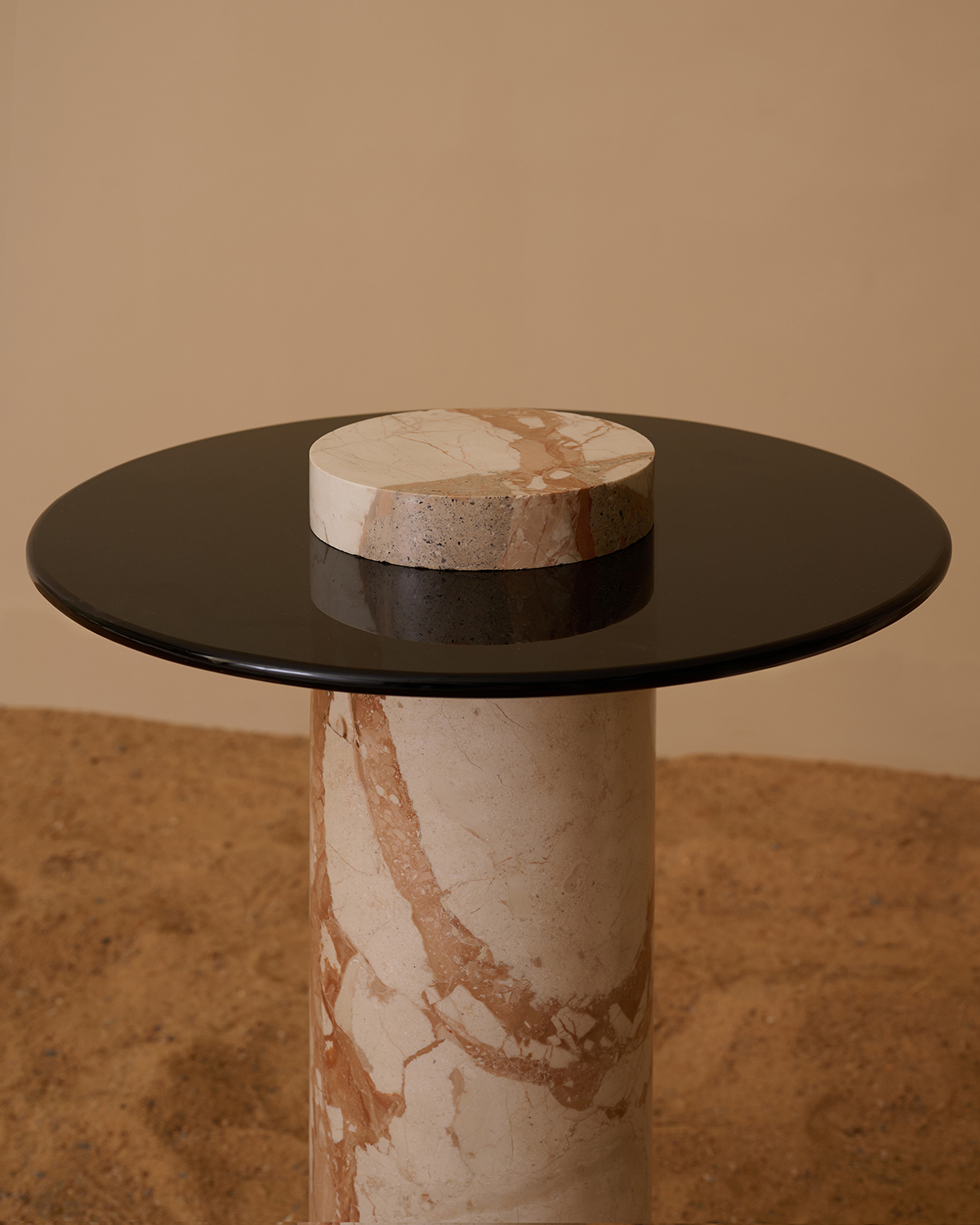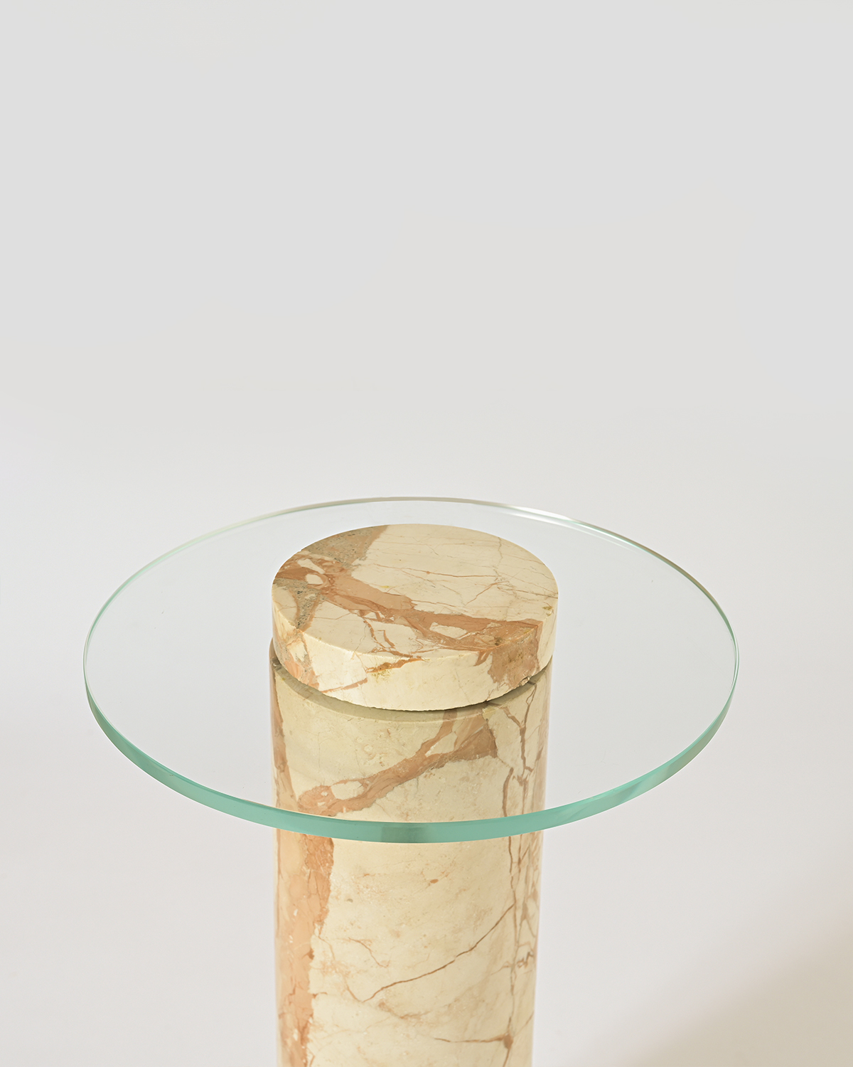 Dhir side table is a stone column with an extended glass top. A very simple yet modern design that states the marriage of two unconventional material, stone and glass.