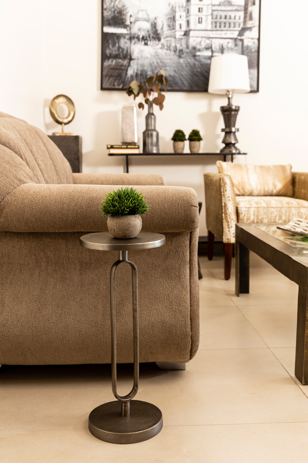 As splendid as a work of modern art, Diono simplifies the drink table with striking austerity. ed in aluminum, the perfectly proportioned table balances a collared top on an elognated oval ring.