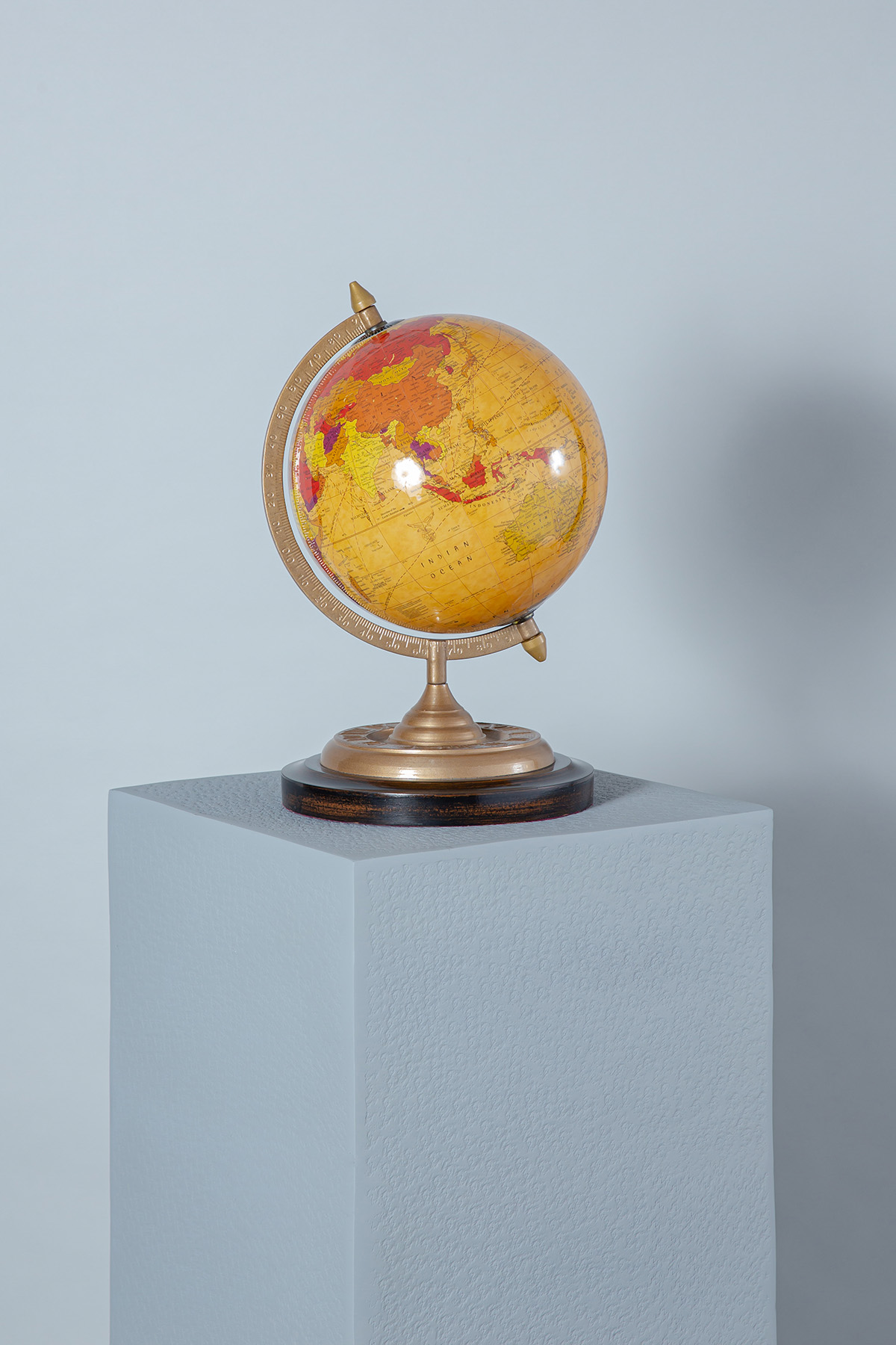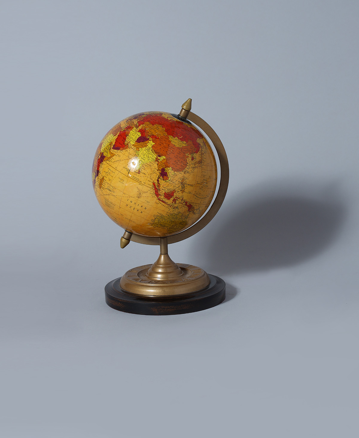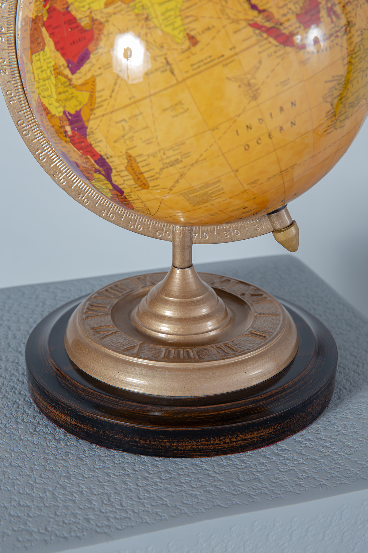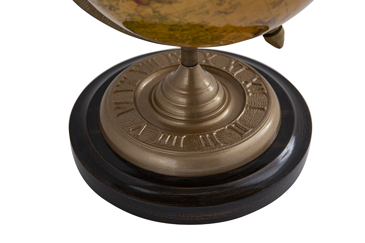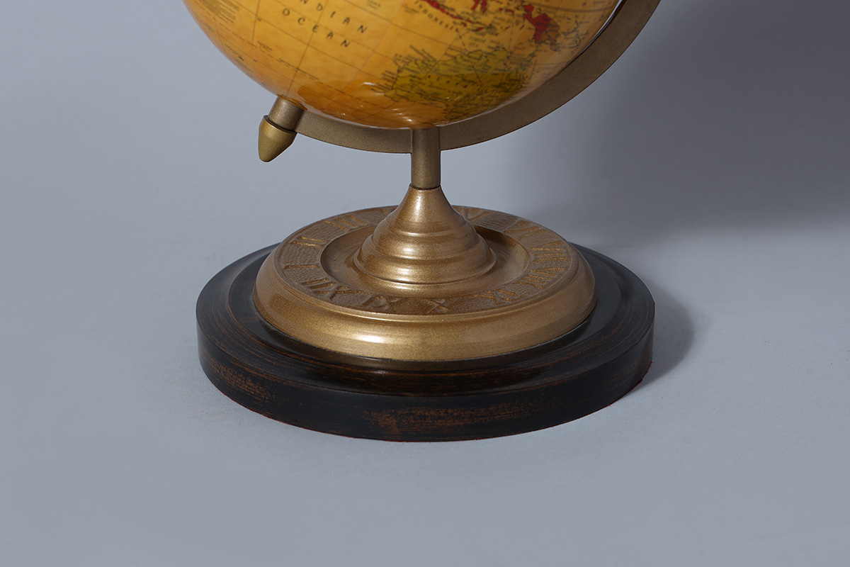 Covered in the pastel beige and brown ocean depicting the landmasses in black metallic color, this globe beautifully highlights a meticulous detailing of the world geography.