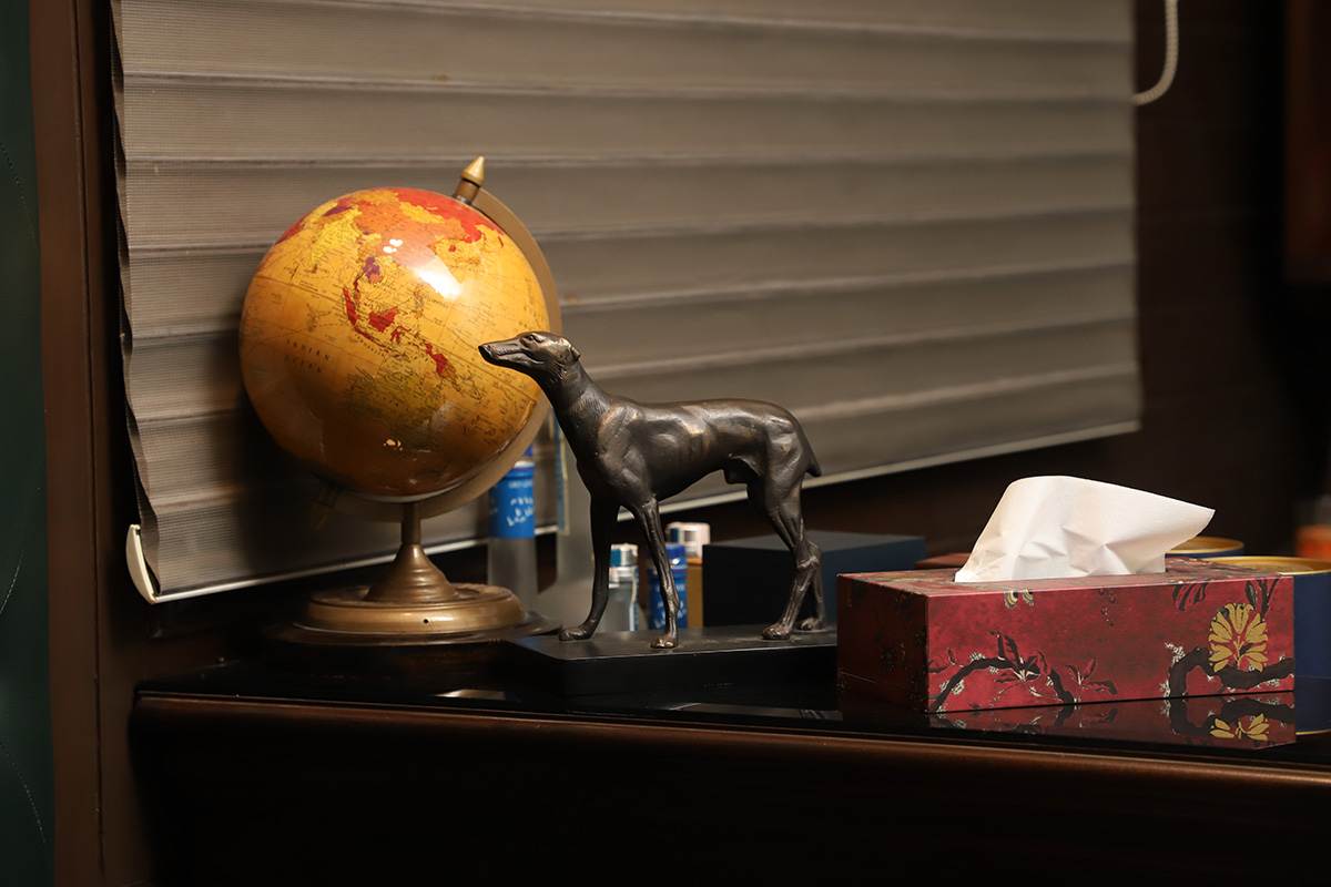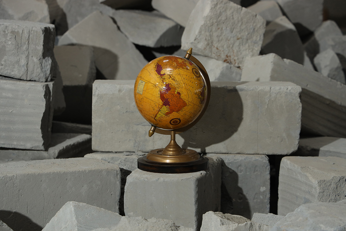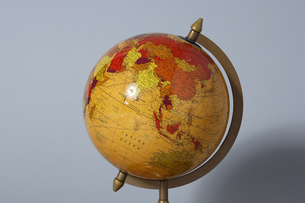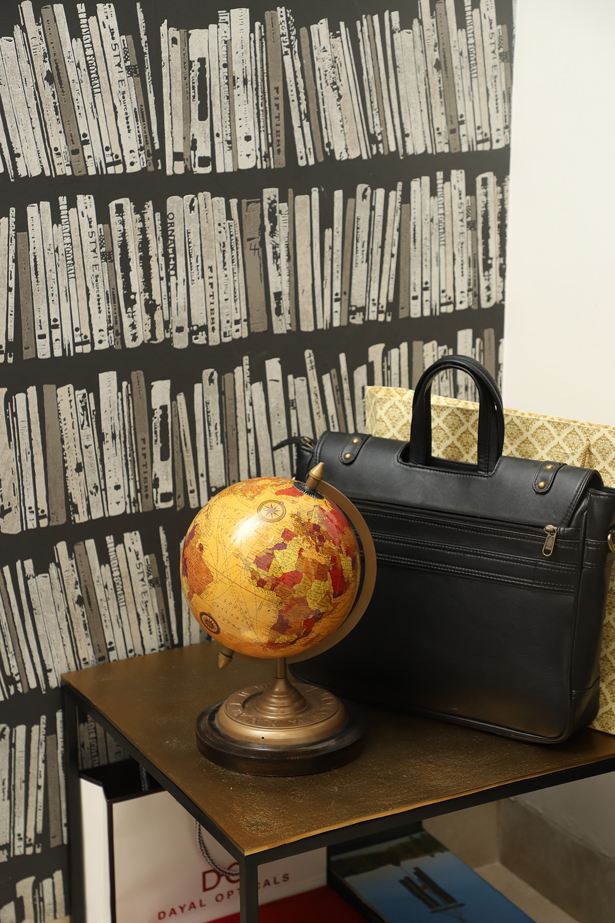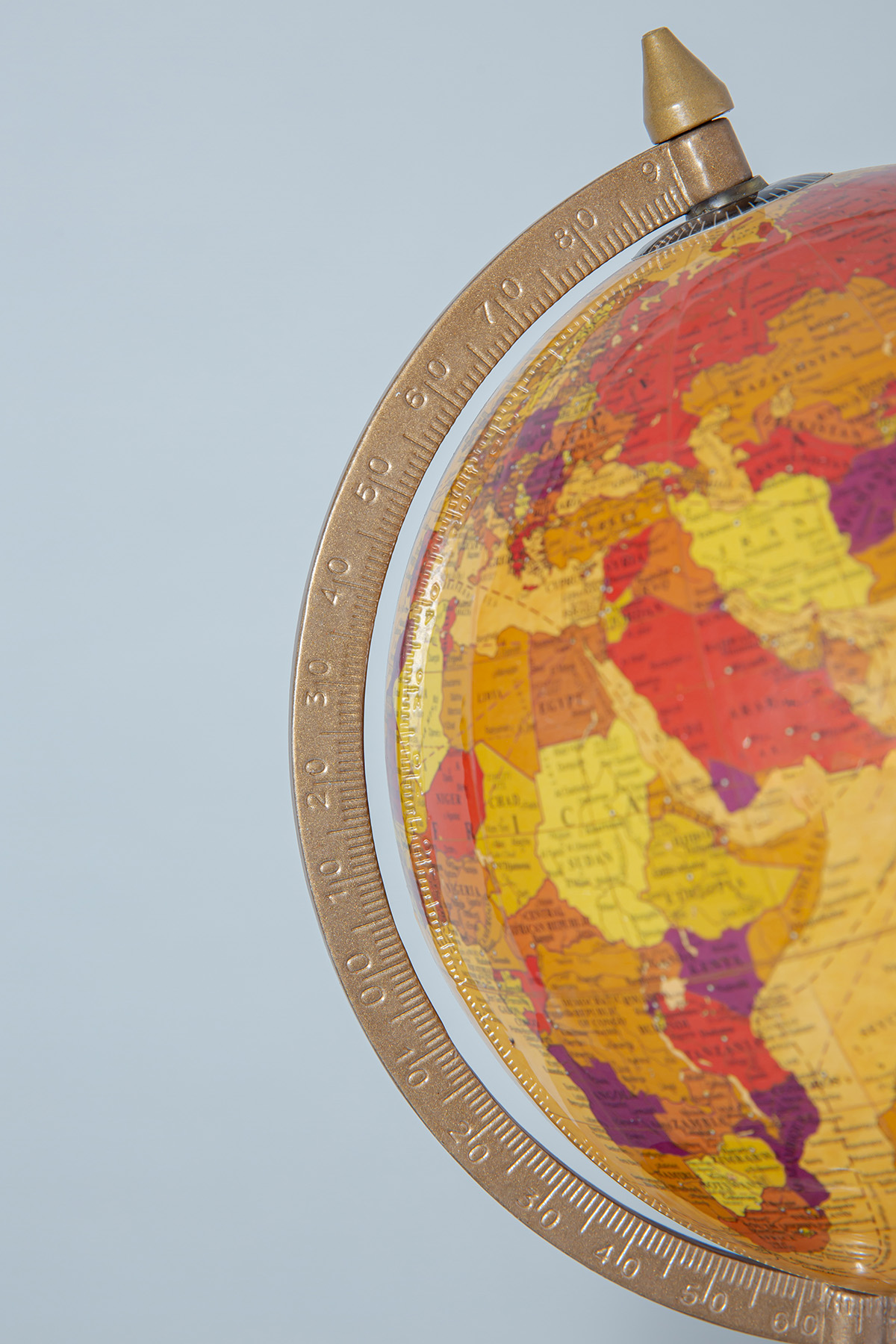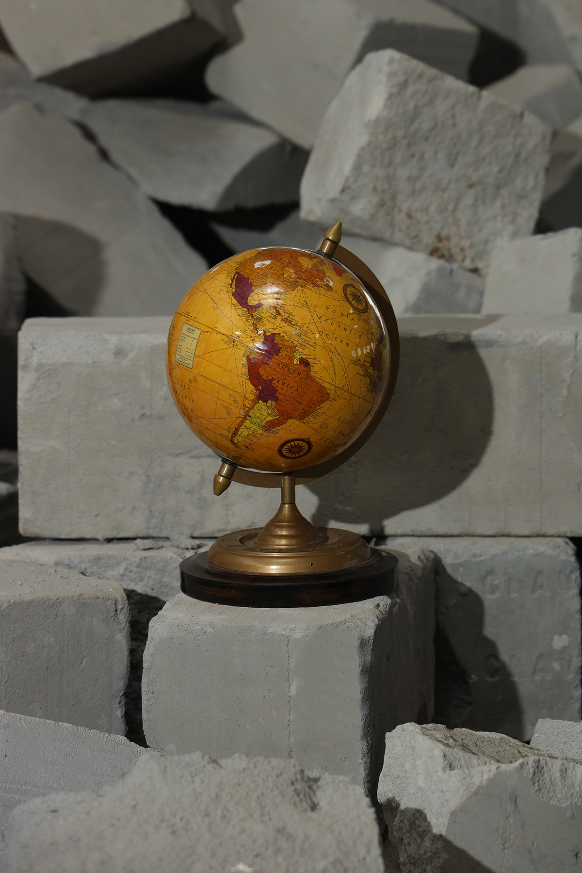 Covered in the pastel beige and brown ocean depicting the landmasses in black metallic color, this globe beautifully highlights a meticulous detailing of the world geography.