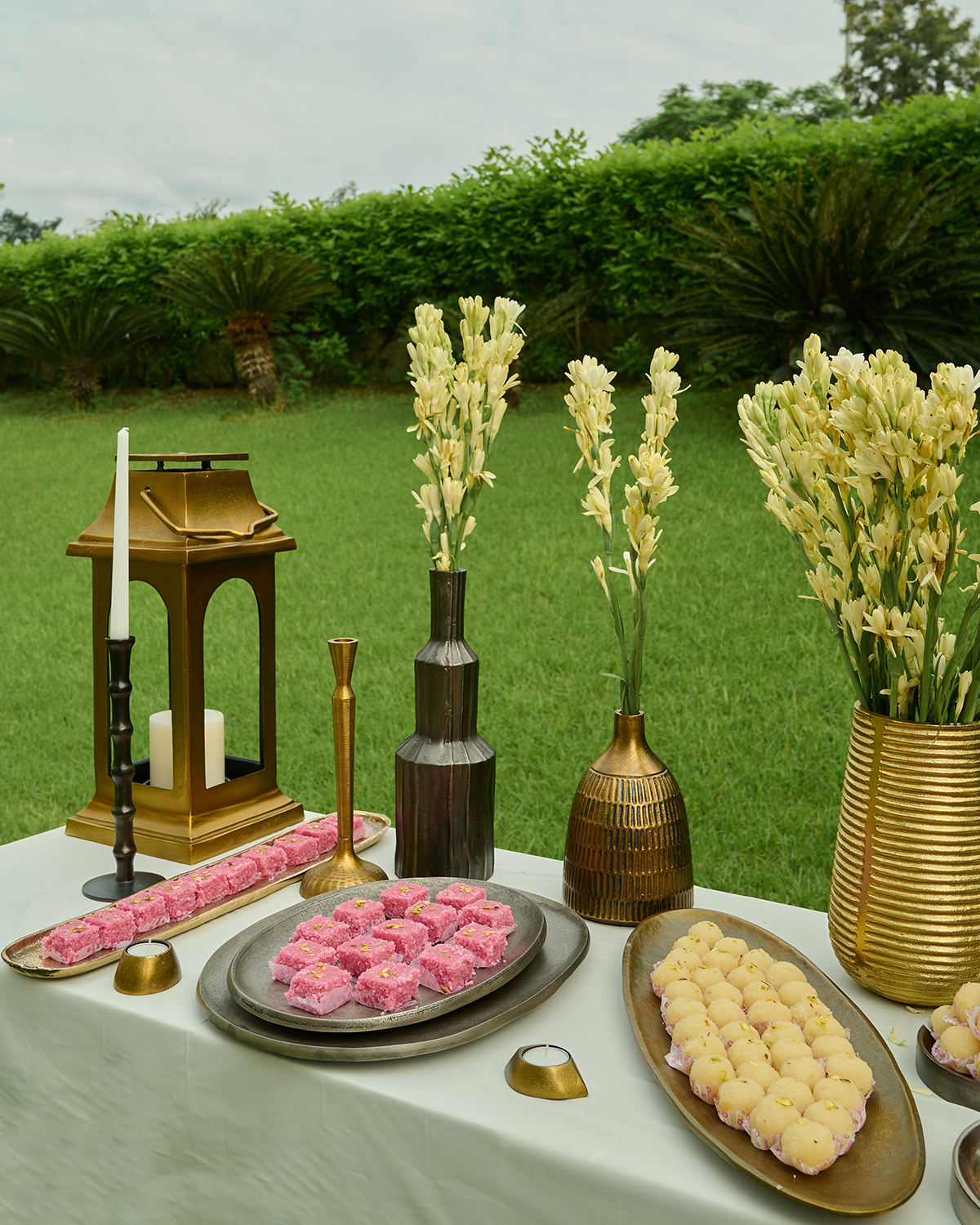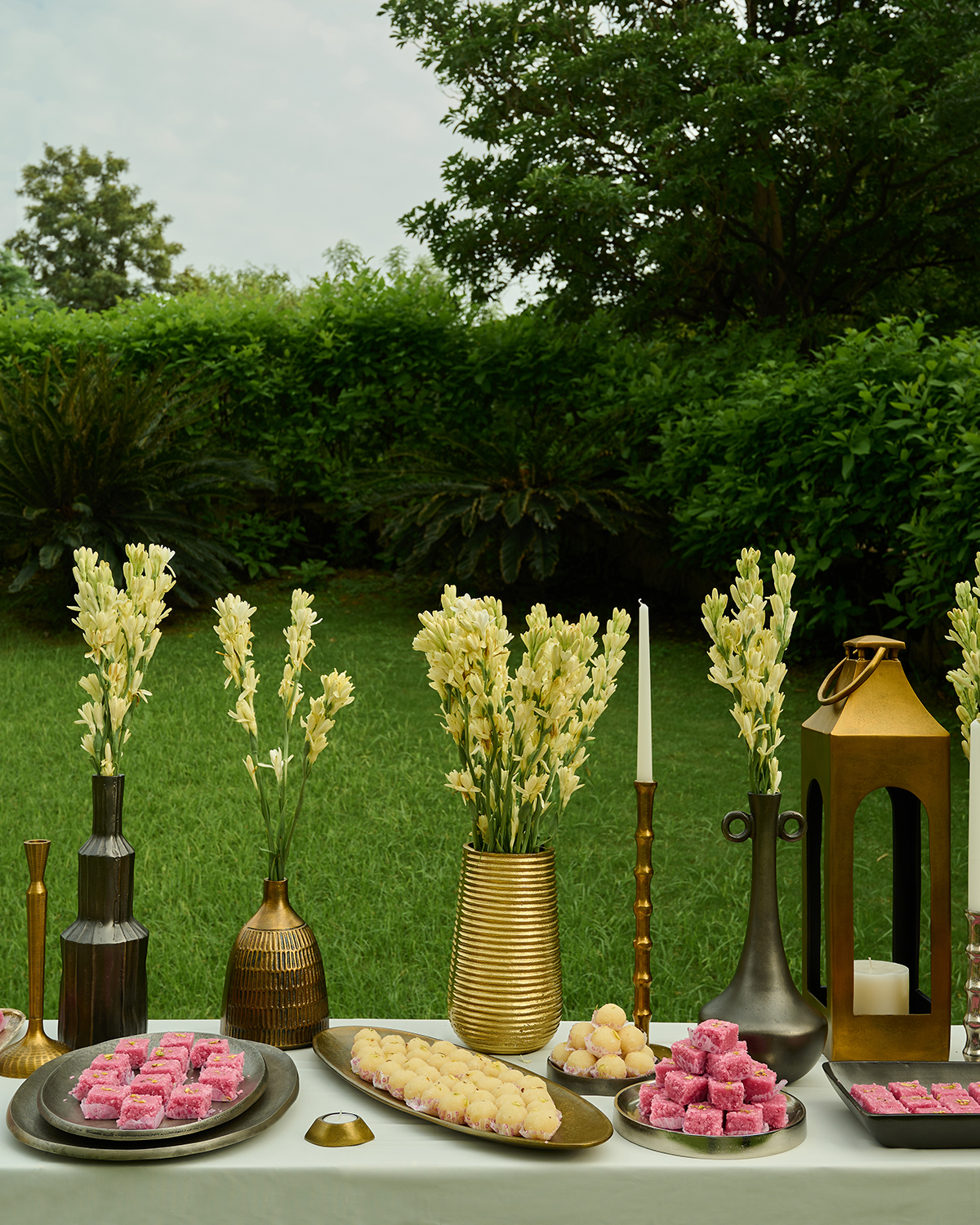 Shop Vritt Tray in cast aluminium with brass antique finish a long elegant tray perfect for serving layering and festive home décor styling